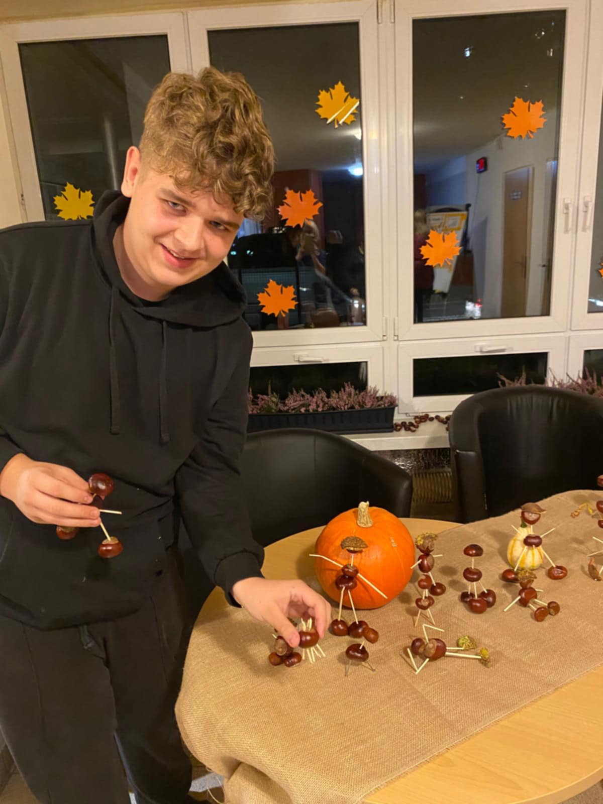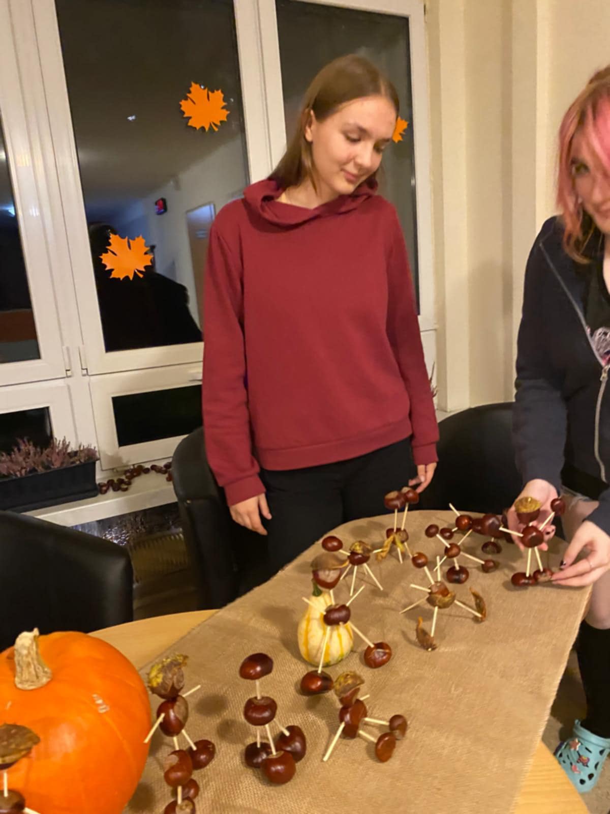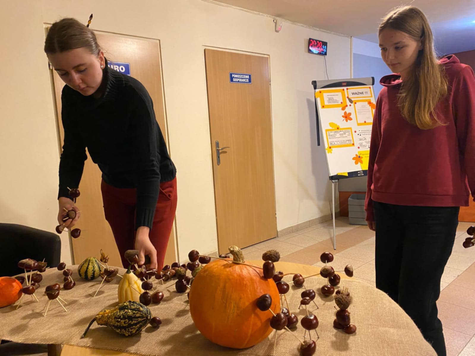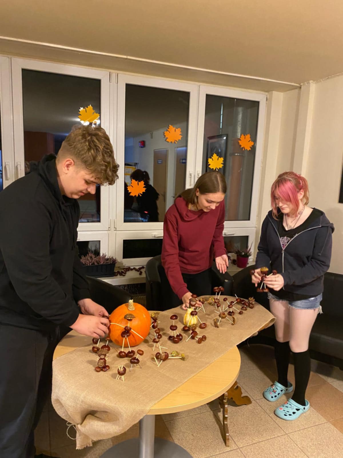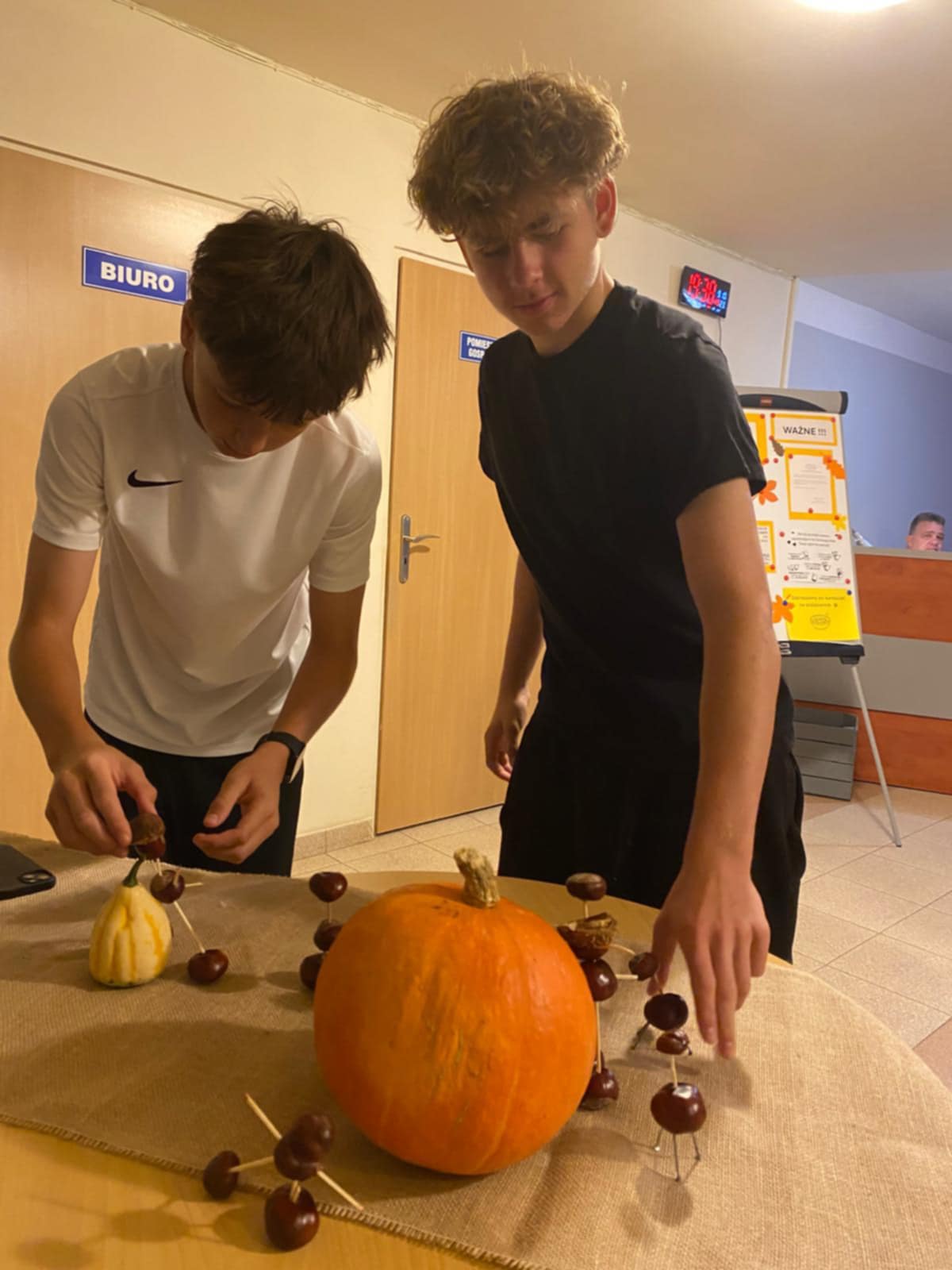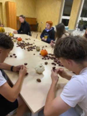 Wychowankowie Bursy nr 11 przynieśli ze sobą dobry humor, mnóstwo energii i kreatywne pomysły. Podczas warsztatów powstały przepiękne jesienne figurki i dekoracje z kasztanów, liści i żołędzi i dyni.